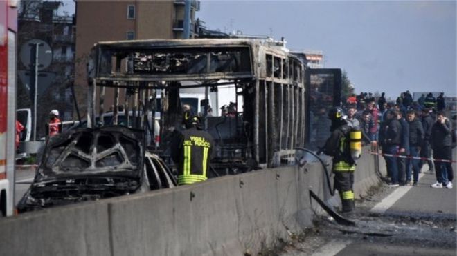 BASI lililokuwa limebeba watoto wa shule wapatao 51 lilitekwa na kutiwa moto karibu na jiji la Milan nchini Italia.